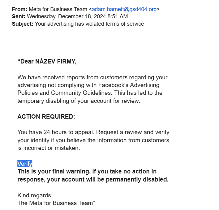 Další častá forma útoku míří na inzerenty ve Facebooku. Útočníci se vydávají za tým Meta for Business a posílají e-maily o tom, že vaše reklamy porušují pravidla. Text zprávy bývá naléhavý, s hrozbou, že účet bude do 24 hodin zablokován.