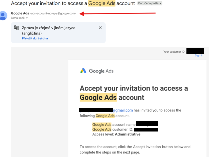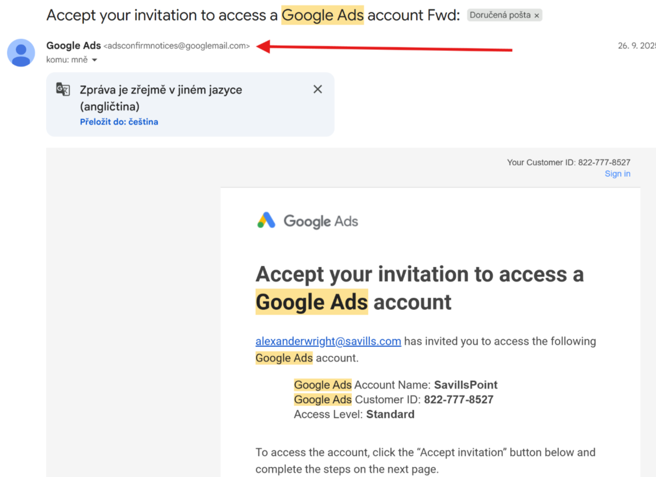 - Přišla pozvánka ke správě účtu Google Ads.